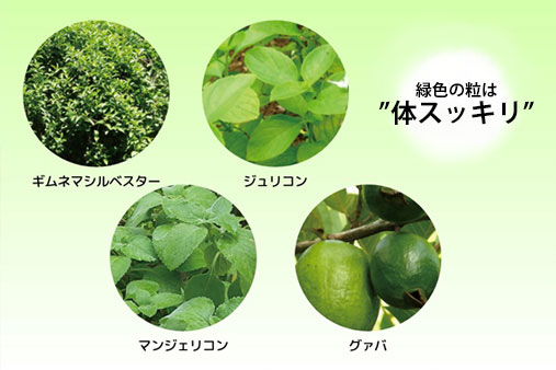 | 原料名(物質名) | 春ウコン、沖縄皇金、食物繊維(イヌリン)、難消化性デキストリン、乳糖、グァバ、ギムネマシルベスタ、紫ウコン、白ウコン、マンジェリコン、ジュリコン/セルロース、ショ糖脂肪酸エステル、シェラック |